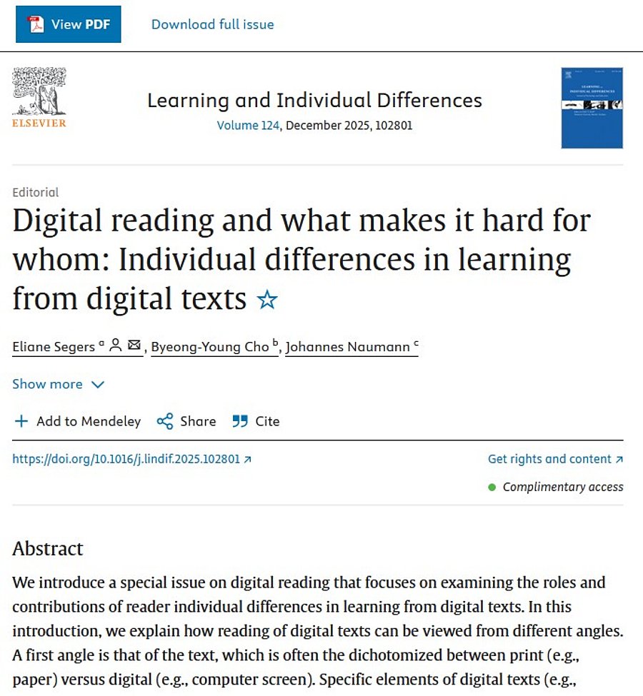 Gemeinsam herausgegeben mit Eliane Segers (Nijmegen, Niederlande) und Byeong-Young Cho (Seoul, Republik Korea) ist in im Journal Learning and Individual Differences ein Special Issue zum Thema "Digital reading and what makes it hard for whom: Individual differences in learning from digital text" erschienen. Das Editorial (E. Segers, B.-Y. Cho, & J. Naumann) findet sich hier: doi.org/10.1016/j.lindif.2025.102801.